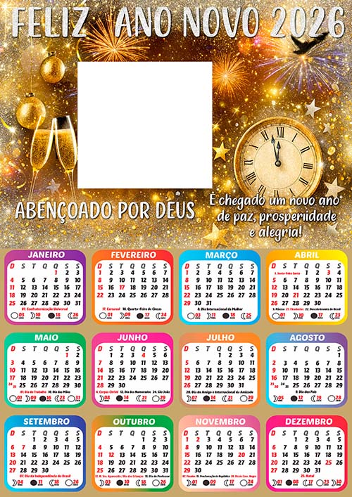 ✅ Arte Digital Calendário 2026 com Feriados de Feliz Ano Novo – Pronto para Montagem de Foto e Imprimir em Alta Qualidade!