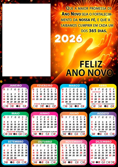 ✅ Arte Digital Calendário 2026 com Feriados de Feliz Ano Novo – Pronto para Montagem de Foto e Imprimir em Alta Qualidade!