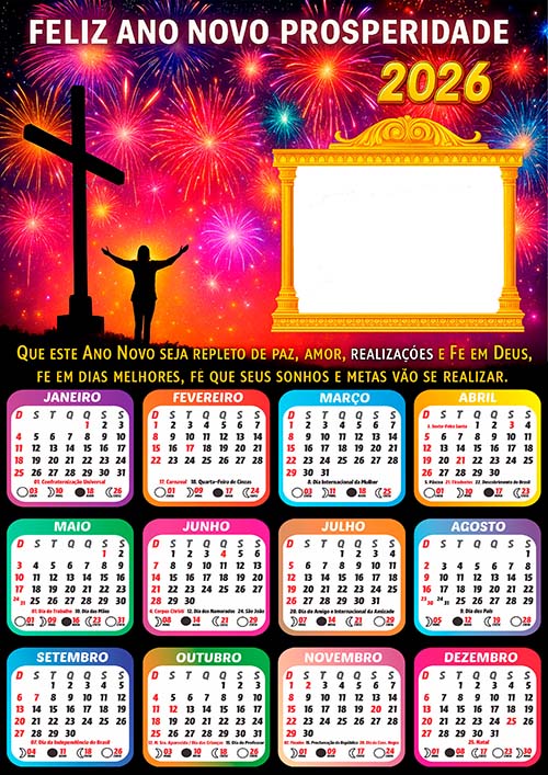 ✅ Arte Digital Calendário 2026 com Feriados de Feliz Ano Novo – Pronto para Montagem de Foto e Imprimir em Alta Qualidade!