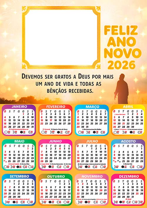 ✅ Arte Digital Calendário 2026 com Feriados de Feliz Ano Novo – Pronto para Montagem de Foto e Imprimir em Alta Qualidade!