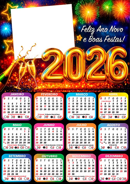 ✅ Arte Digital Calendário 2026 com Feriados de Feliz Ano Novo – Pronto para Montagem de Foto e Imprimir em Alta Qualidade!