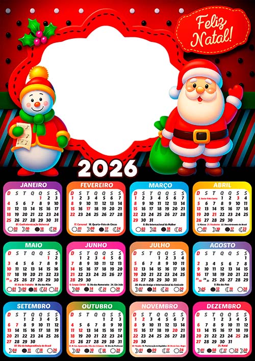Adquira agora sua Moldura Calendário 2026 Boneco de Neve e Noel Feliz Natal com feriados e comece hoje mesmo a criar momentos especiais.