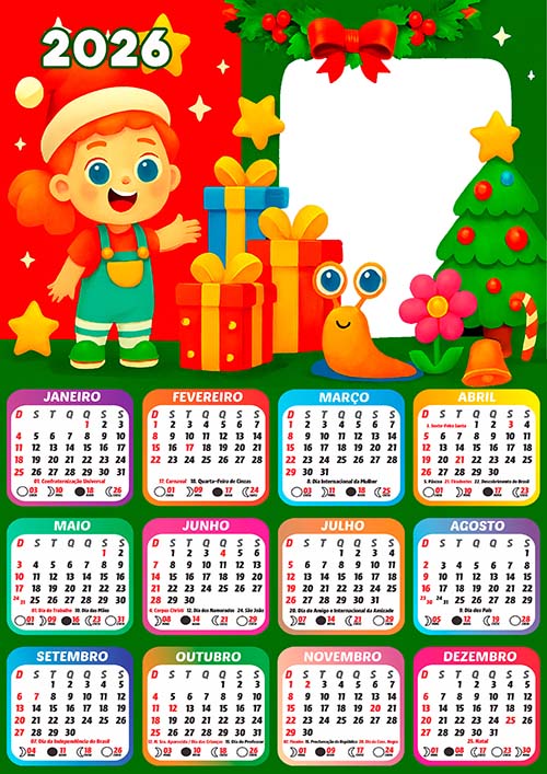 Adquira agora sua Moldura Calendário 2026 Criança Feliz Natal com feriados e comece hoje mesmo a criar momentos especiais.