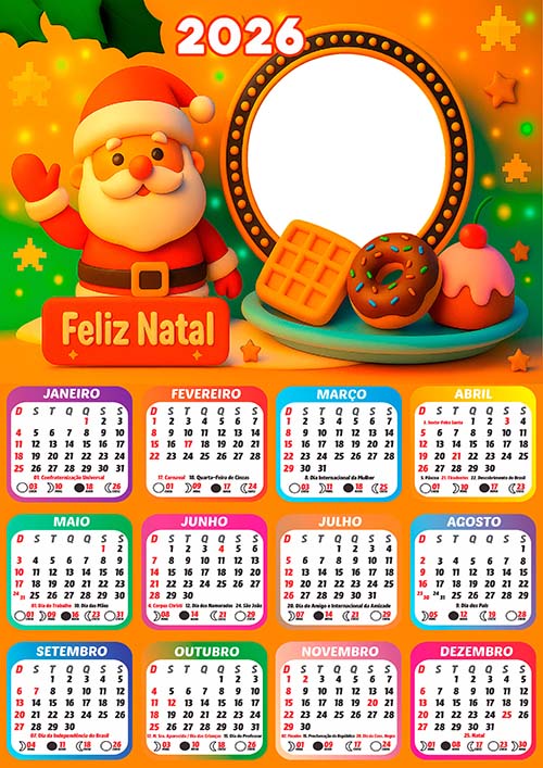 Adquira agora sua Moldura Calendário 2026 Doces de Natal Papai Noel com feriados e fase da lua e comece hoje mesmo a criar momentos especiais.