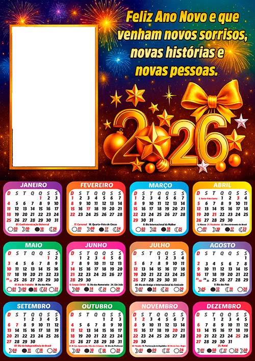 ✅ Arte Digital Calendário 2026 com Feriados de Feliz Ano Novo – Pronto para Montagem de Foto e Imprimir em Alta Qualidade!