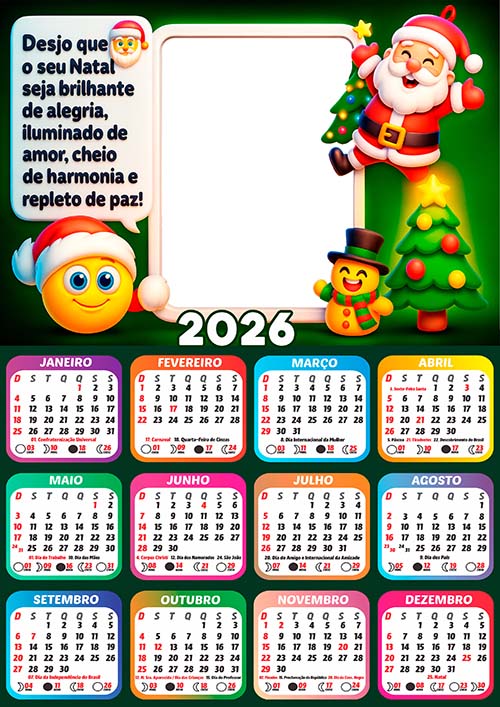 Adquira agora sua Moldura Calendário 2026 Frase de Natal e Papai Noel com feriados e fase da lua e comece hoje mesmo a criar momentos especiais.