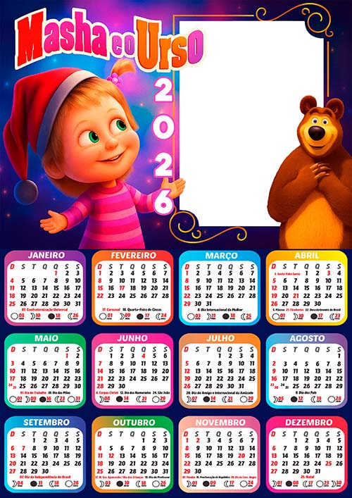 Adquira agora sua Moldura Calendário 2026 Masha e o Urso Natal com feriados e fase da lua e comece hoje mesmo a criar momentos especiais.