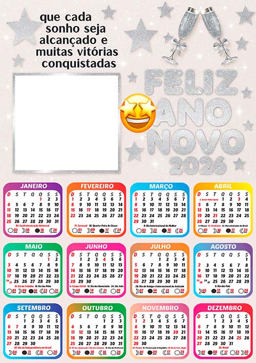 ✅ Arte Digital Calendário 2026 com Feriados de Feliz Ano Novo – Pronto para Montagem de Foto e Imprimir em Alta Qualidade!