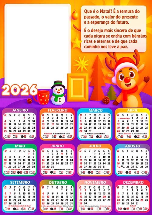 Adquira agora sua Moldura Calendário 2026 Natal com Rena do Papai Noel com feriados e comece hoje mesmo a criar momentos especiais.