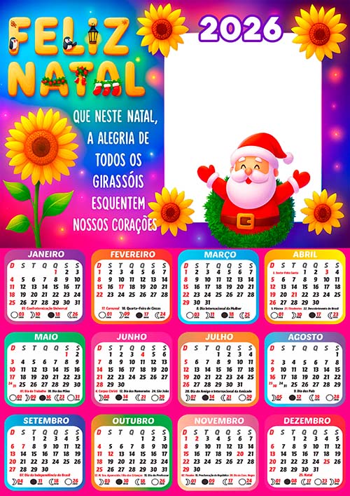 Adquira agora sua Moldura Calendário 2026 Natal Papai Noel Girassóis com feriados e fase da lua e comece hoje mesmo a criar momentos especiais.