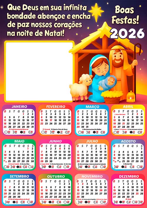 ✅ Arte Digital Calendário 2026 com Feriados – Pronto para Montagem de Foto e Imprimir em Alta Qualidade!
