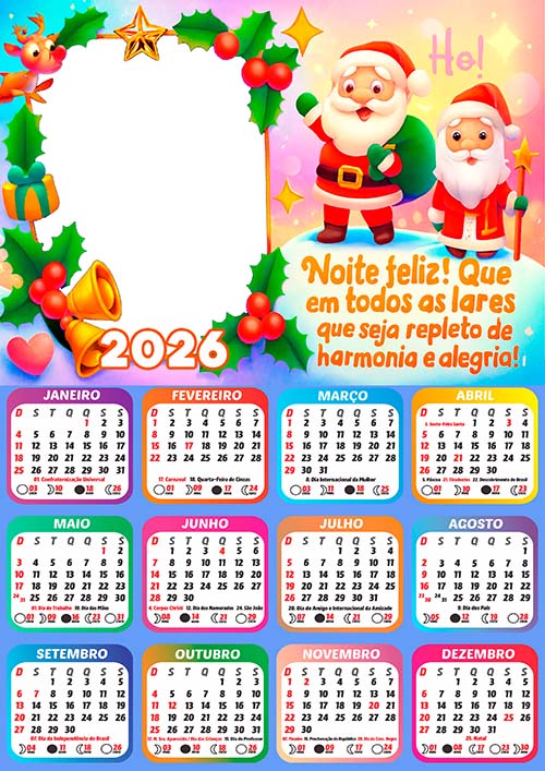 Adquira agora sua Moldura Calendário 2026 Noite Feliz Papai Noel com feriados e fase da lua e comece hoje mesmo a criar momentos especiais.