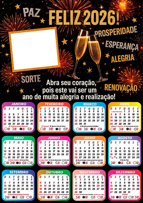 ✅ Arte Digital Calendário 2026 com Feriados de Feliz Ano Novo – Pronto para Montagem de Foto e Imprimir em Alta Qualidade!