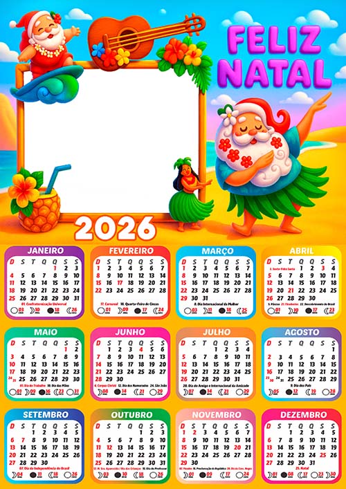 Adquira agora sua Moldura Calendário 2026 Papai Noel Dança Havaiana com feriados e fase da lua e comece hoje mesmo a criar momentos especiais.