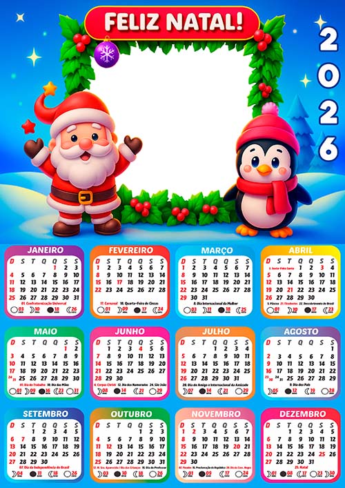 Adquira agora sua Moldura Calendário 2026 Pinguinho e Papai Noel com feriados e fase da lua e comece hoje mesmo a criar momentos especiais.