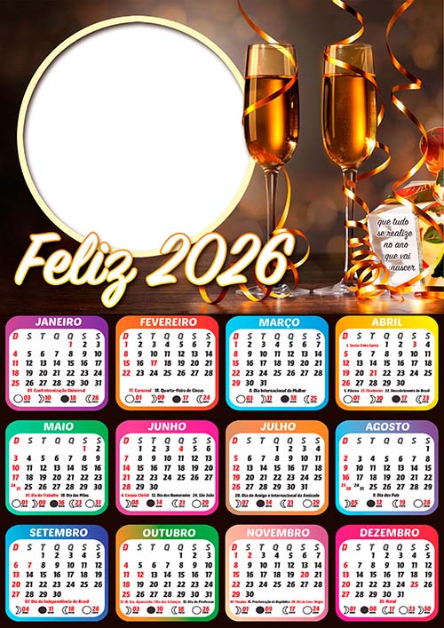 ✅ Arte Digital Calendário 2026 com Feriados de Feliz Ano Novo – Pronto para Montagem de Foto e Imprimir em Alta Qualidade!