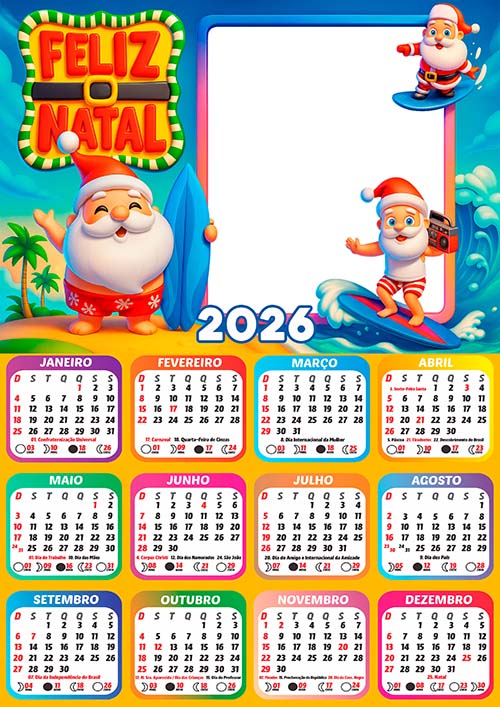 Adquira agora sua Moldura Calendário 2026 Surf Papai Noel com feriados e fase da lua e comece hoje mesmo a criar momentos especiais.