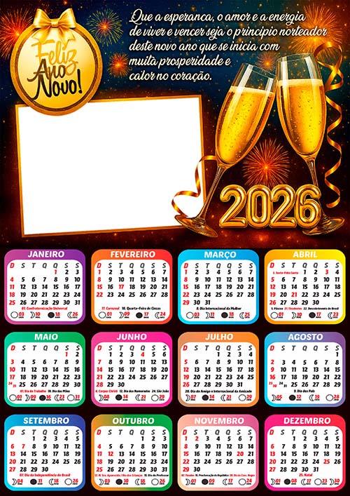 ✅ Arte Digital Calendário 2026 com Feriados de Feliz Ano Novo – Pronto para Montagem de Foto e Imprimir em Alta Qualidade!