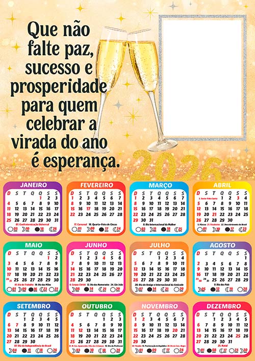 ✅ Arte Digital Calendário 2026 com Feriados de Feliz Ano Novo – Pronto para Montagem de Foto e Imprimir em Alta Qualidade!