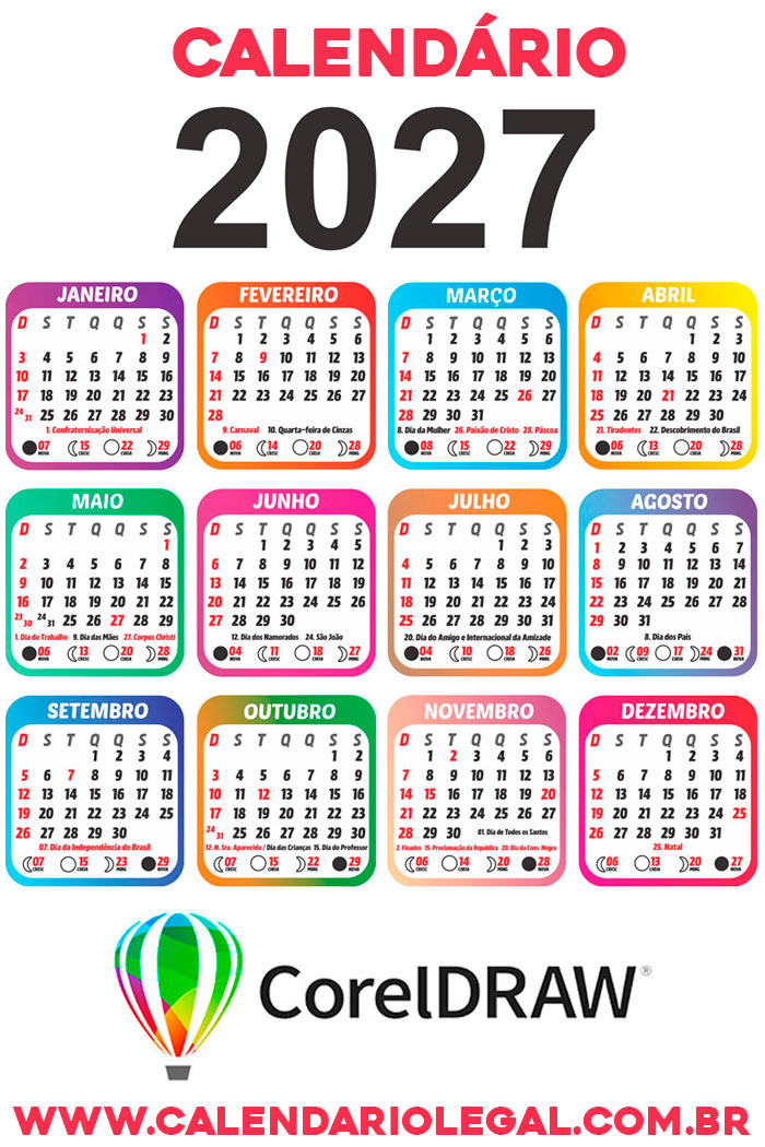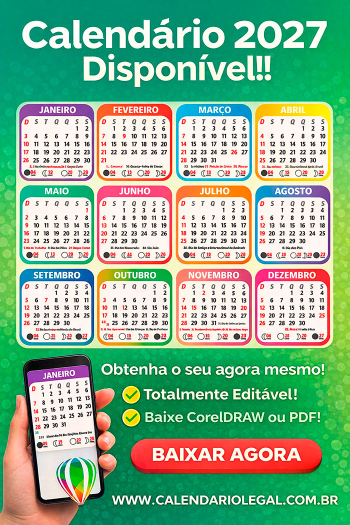 Seu Calendário 2027 completo, com todos os feriados do Brasil já inclusos. Ideal para quem precisa de um calendário 2027 para editar no CorelDRAW ou outros formatos. Produto 100% digital, pronto para download imediato. Perfeito para gráficas, papelarias, brindes personalizados e uso profissional.